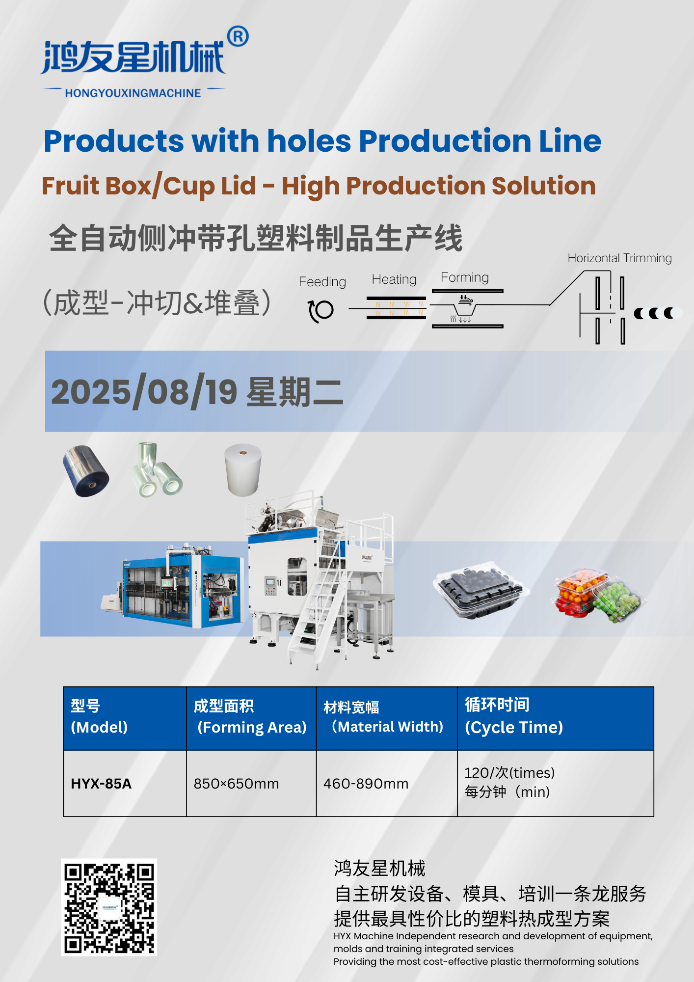 Convient à la production de couvercles de tasses, de boîtes à fraises et de boîtes blister avec trous latéraux et inférieurs. machines de formage de blisters (également connues sous le nom de machines de blister/machines de test de poinçonnage) sont des équipements hautement automatisés capables de répondre à des exigences d'emballage complexes et sont particulièrement largement utilisés dans l'industrie de l'emballage alimentaire. Ces machines prennent non seulement en charge le formage de blisters conventionnel, mais créent également avec précision diverses positions de trous, telles que des trous latéraux et inférieurs, pour répondre aux diverses exigences fonctionnelles de l'emballage.